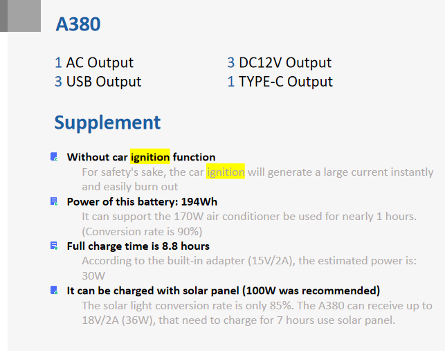 Car Charger Output: No cigarette lighter port, can be equipped with adapter cable (DC to